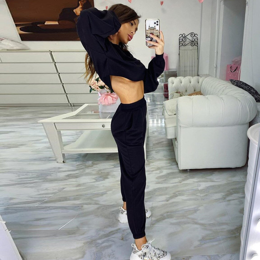 Women Set Casual Long Sleeve Crop Top And Pants Trousers Two Piece