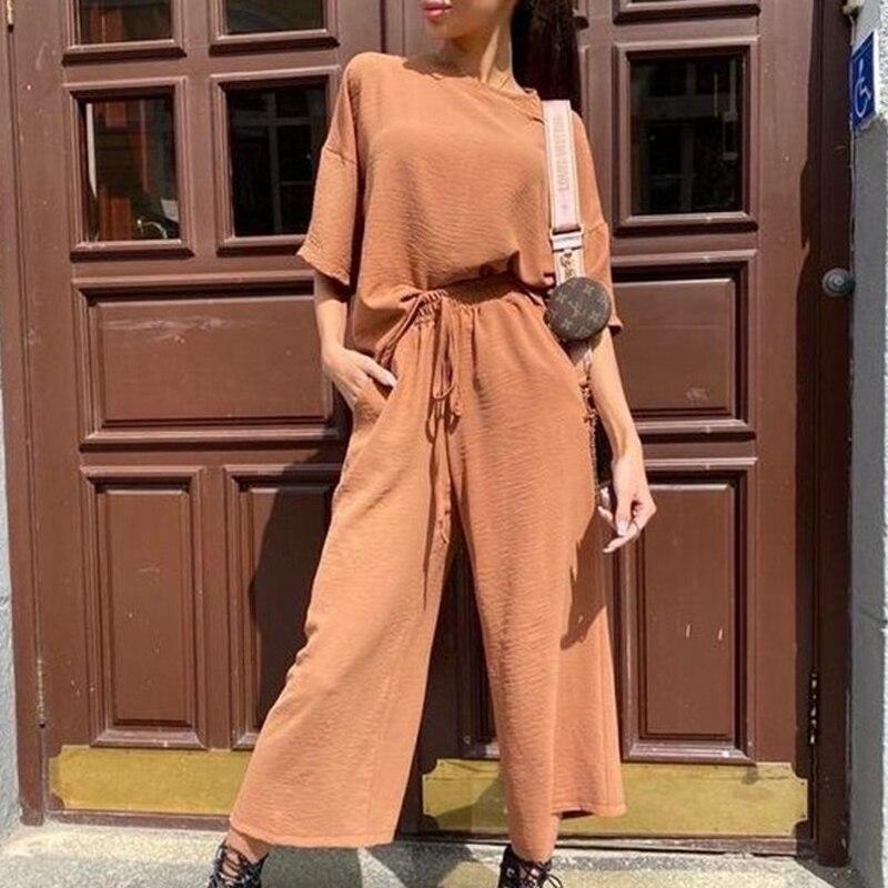 2 Piece Set Women Summer O Neck Short Sleeve Shirt and Drawstring Wide