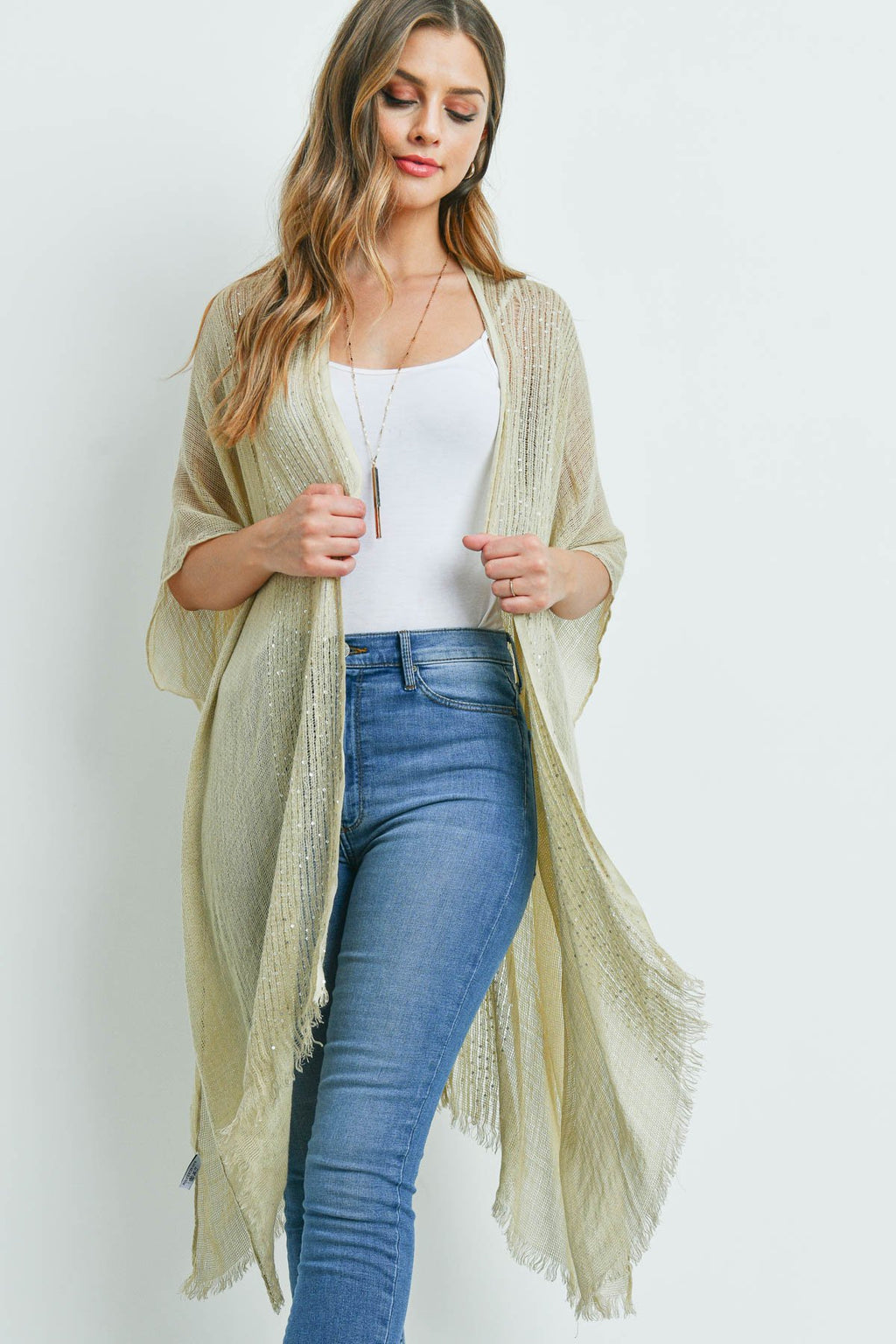 Hdf2498bg - Beige Glittered Fringed Open Cardigan