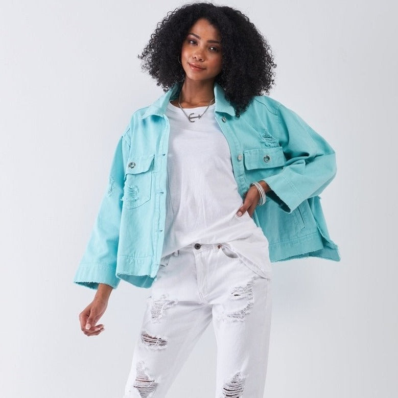 Washed Distressed Button-down Front Raw Hem Detail Wide Sleeve Oversized Denim Jacket