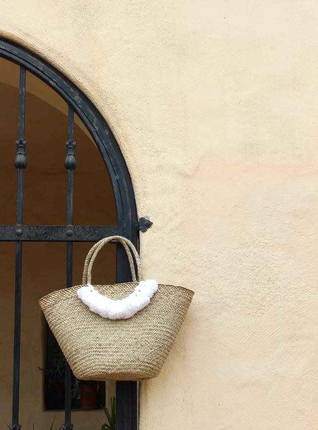 Natural Margarita Straw Party Clutch, with Nude Pom-poms