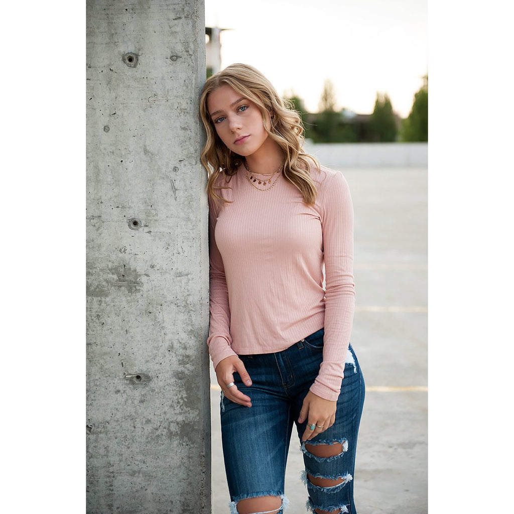 Ribbed Crew Neck Long Sleeve Tee in Dusty Pink