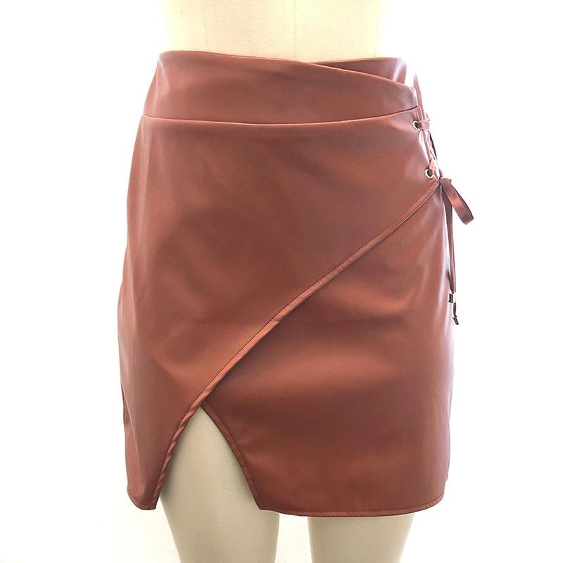 Brown lace up A-line girls short skirt PU leather mini skirt