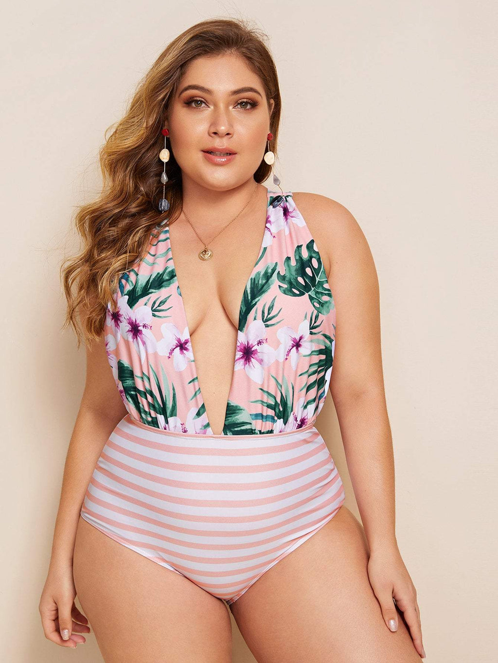 Queen Plus Collection Floral & Striped Criss Cross One Piece Swimwear