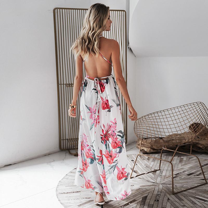 Backless Boho Floral Print Long Dress Chiffon Summer Maxi Dress